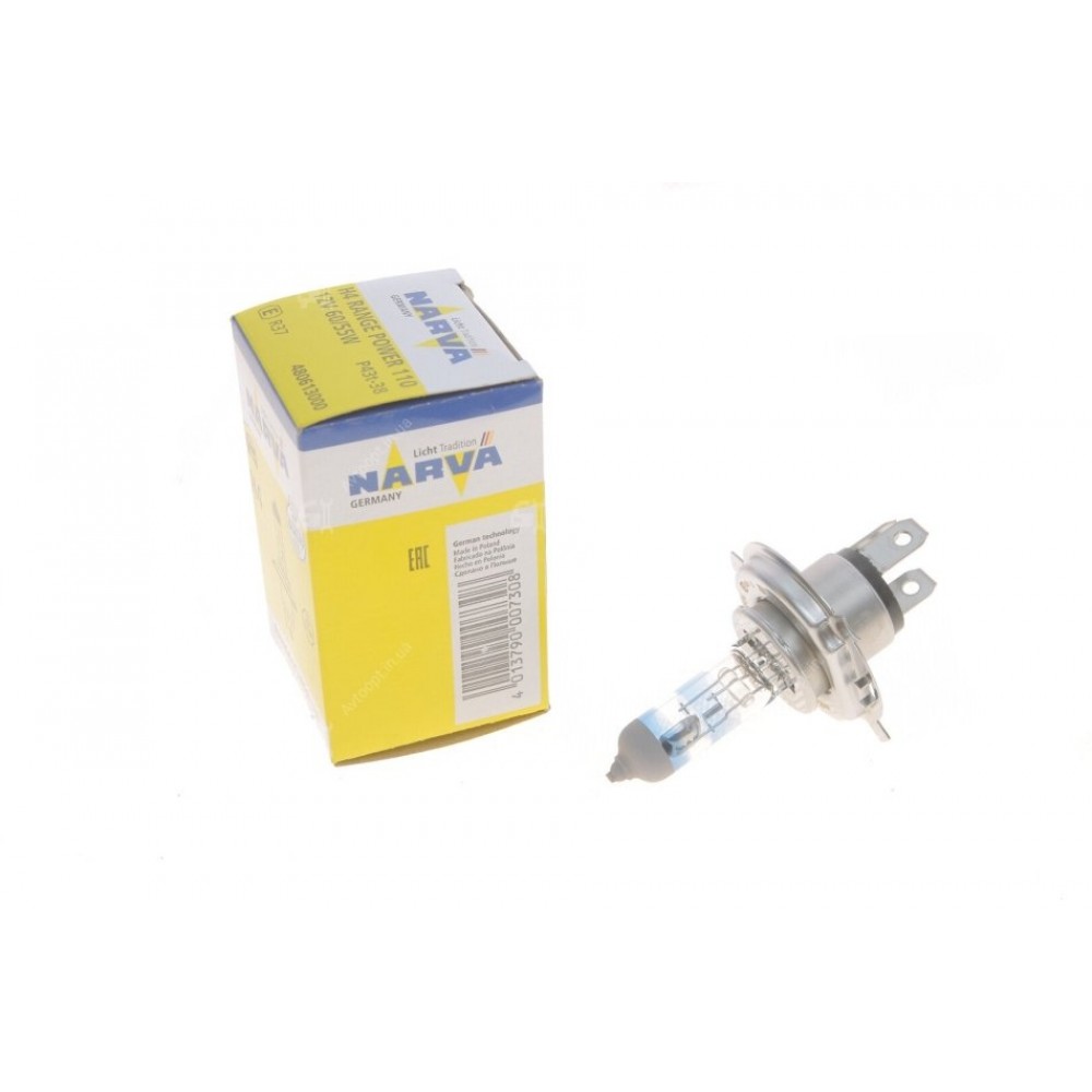 Переваги 480613000 NARVA Лампа H4 60/55W P43t 12V (+110%) RANGE POWER 110 48061
