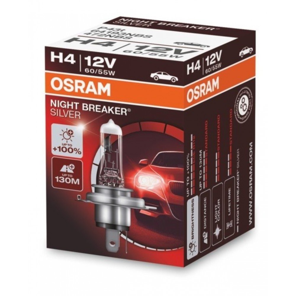 Лампа OSRAM H4 60/55W 12V P43T NIGHT BREAKER SILVER +100% забезпечує на 100% більше світла в порівнянні зі стандартними лампами. Вона має покращену видимість на дорозі, що підвищує безпеку водіння в темний час доби. Завдяки спеціальному дизайну, лампа забезпечує яскраве та чітке світло, що дозволяє краще бачити перешкоди та дорожні знаки.