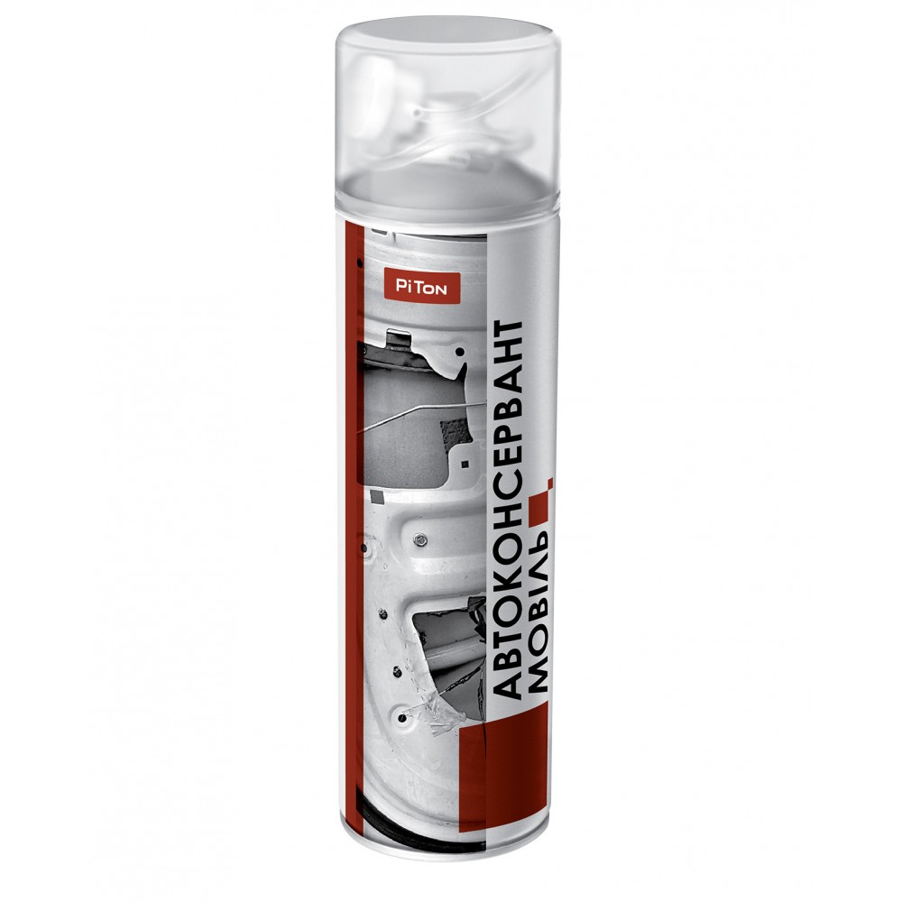 Автоконсервант Мовіль PiTon Автоконсервант Мовіль PiTon з натуральним воском - це надійне та еластичне антикорозійне покриття, спеціально розроблене для захисту внутрішніх порожнин кузова автомобіля. Цей продукт ідеально підходить для обробки порогів, дверей, багажника, стійок, лонжеронів, підкапотного простору, а також колісних арок і днища.Особливості: Еластична плівка: Мовіль PiTon утворює еластичну плівку, стійку до атмосферних впливів і перепадів температур, що гарантує ефективний захист від руйнівного впливу вологи, солей і дорожніх реагентів. Висока ефективність: Витіскає вологу, ізолює поверхню від проникнення води й кисню, блокує осередки іржавіння, зупиняє подальший розвиток корозії. Зручне використання: За допомогою гнучкої трубки з латунним наконечником, яка знаходиться під кришкою балона, можна легко обробляти внутрішні порожнини закритих профілів, забезпечуючи повноцінний захист. Сумісність з лакофарбовими матеріалами: Мовіль сумісний з усіма типами лакофарбових матеріалів, що робить його універсальним рішенням для автомобільного догляду. Використання: Підготовка поверхні: Ретельно очистіть поверхню від бруду і іржі. Розмішування: Струсіть балон принаймні 2-3 хвилини для гарантії однорідного шару покриття. Нанесення: Наносьте рівномірний шар на пласкі поверхні з відстані 25-30 см за допомогою розприскувача. Внутрішні порожнини закритих профілів обробляйте за допомогою трубки з латунним наконечником. Післяопрацювання: Оброблена поверхня стає придатною до експлуатації за 2 години. Примітка: Після використання необхідно очистити клапан балона, перевернувши його розприскувачем донизу та натискуючи, щоб уникнути забивання розприскувача висохшим засобом.