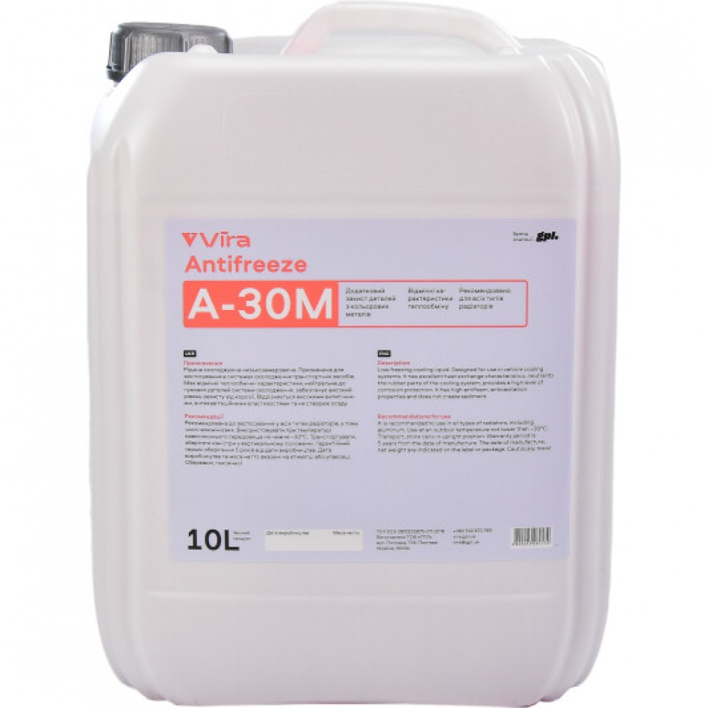 Теплоносій VIRA Coolant -30 °C призначений для використання в системах опалення, забезпечуючи ефективну передачу тепла. Він має червоний колір, що полегшує візуальну ідентифікацію рідини. Цей теплоносій здатний витримувати температури до -30 °C, що робить його ідеальним для використання в холодних кліматичних умовах. Об'єм упаковки становить 10 кг, що забезпечує достатню кількість рідини для заповнення системи. VIRA Coolant також має антикорозійні властивості, що продовжує термін служби обладнання. Його формула розроблена для забезпечення стабільної роботи системи опалення протягом тривалого часу.