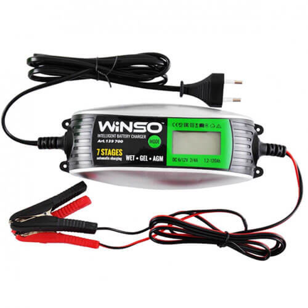 Зарядний пристрій АКБ WINSO 6/12В 4А 139700Імпульсний зарядний пристрій для автомобільних та мотоциклетних акумуляторів Winso 139700 підійде для відновлення ємності свинцево-кислотних акумуляторів, а також GEL та AGM, з номінальним навантаженням 6 вольт і 12 вольт. На функціональній панелі пристрою розташований дисплей для контролю роботи пристрою в режимі реальної години, функціональна кнопка вибору режиму роботи дозволяє встановити оптимальні параметри зарядки. Пластиковий корпус має ергономічний дизайн та компактні габаритні розміри. Плюсовий та мінусовий провід підключення мають червоний та чорний колір відповідно, що мінімізує можливості підключення з неправильною полярністю. Клемні затискачі виконані у вигляді крокодилів із ізоляцією на ручках для безпечного монтажу. Потужність пристрою становить 230 Вт, ємність підключеного аккумулятора 1,2 - 120 Ач, а сила струму на виводах 2 або 4 ампери. Дане ЗУ заряджає батареї в автоматичному режимі. Сім ступенів зарядки та перевірки відбуваються за рахунок роботи вбудованого мікропроцесора.Перед використанням ЗУ Winso 139700 прочитайте інструкцію з експлуатації, а також дотримуйтесь техніки безпеки.