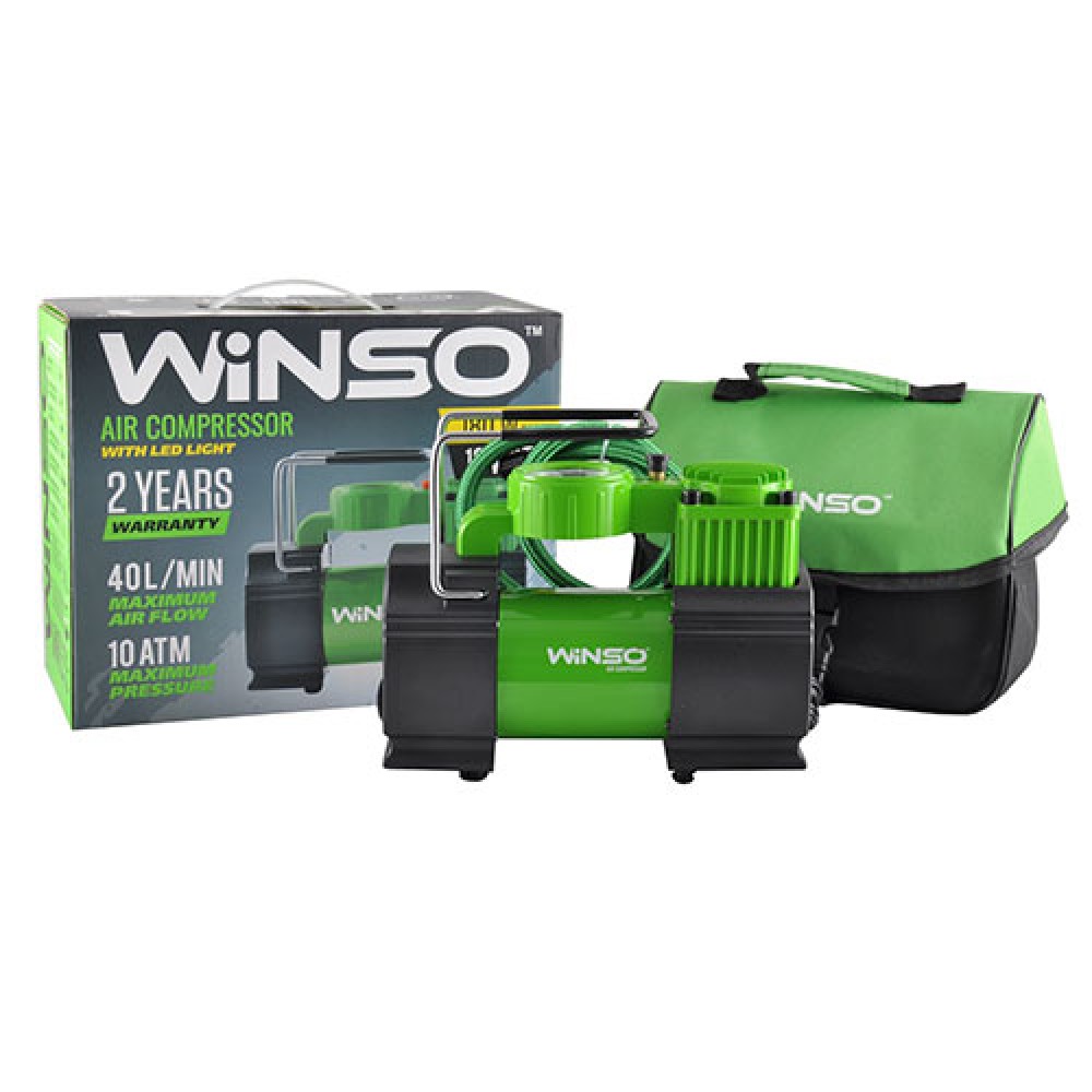 Автомобільний компресор 10 Атм, 40 л/хв. 200ВтКомпрессор автомобільний WINSO 126000 підходить для підкачки шин легкових автомобілів, а також дрібного транспорту, джипів, велосипедних шин та будь-яких шин мотоциклів, а також мячів, матраців, човнів. Відрізняється високою мірою надійності і легкістю обігу.Компрессор підключається до джерела живлення за допомогою клем-крокодилів. Прикурювач в даному випадку не використовується, підживлюючим ланкою виступає акумуляторна батарея в 12 В. Це апарат поршневого типу, досить потужний - 200 Вт, продуктивність становить 40 л/хв, максимально можливе стиснення повітря - 10 атмосфер. У WINSO 126000 передбачена кнопка скидання тиску, є спускний клапан.Компрессор WINSO 126000 має міцний корпус. Манометр у цьому виробі - виносний, розташований на шлангу. У комплектацію входити довгий, кручений шланг - 5,7 м, кабель 3 м, клем-крокодил, набір насадок, зручна сумка для перенесення та зберігання компрессора.